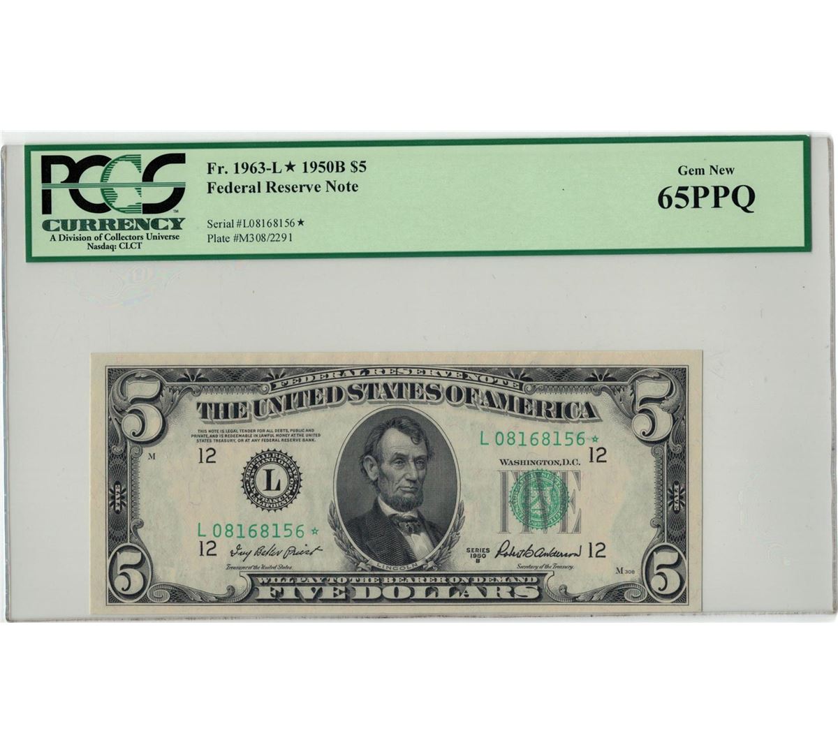 1950-B $5 PCGS Gem New 65PPQ Federal Reserve Note. PCGS Certified.