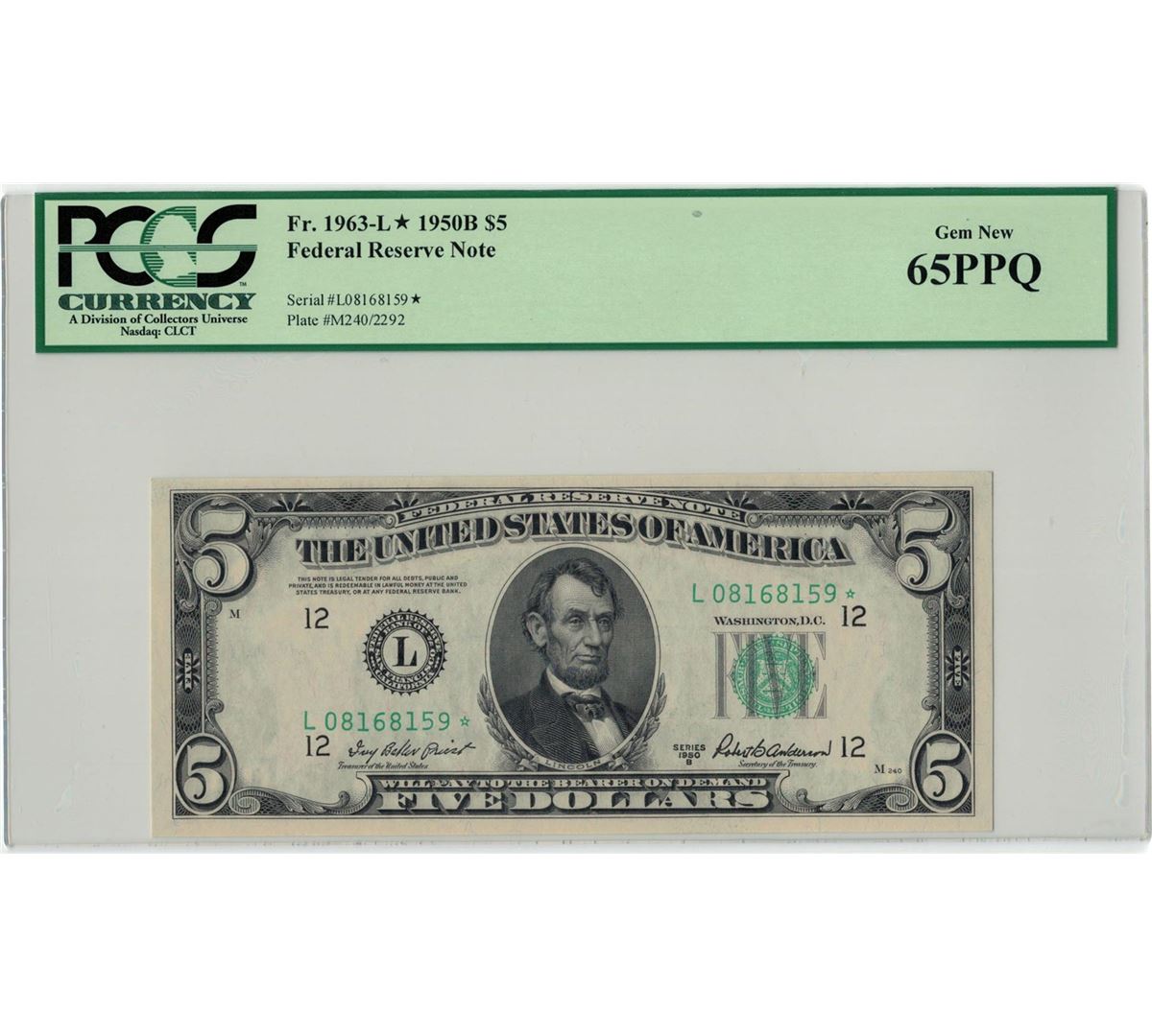 1950-B $5 PCGS Gem New 65PPQ Federal Reserve Note. PCGS Certified.