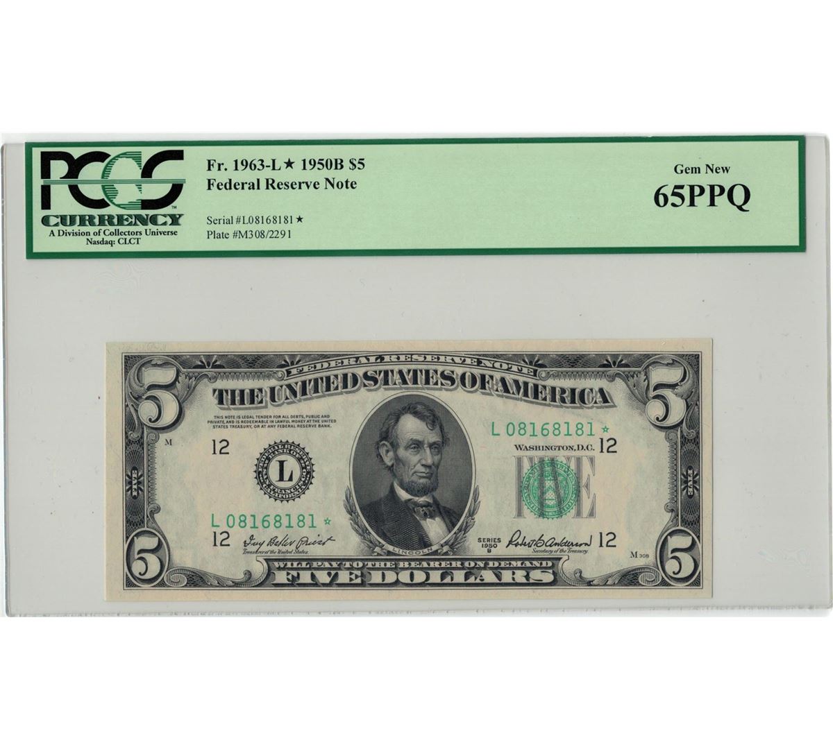 1950-B $5 PCGS Gem New 65PPQ Federal Reserve Note. PCGS Certified.