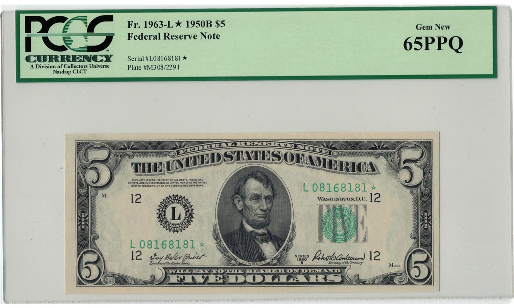 1950-B $5 PCGS Gem New 65PPQ Federal Reserve Note. PCGS Certified.
