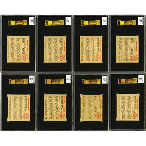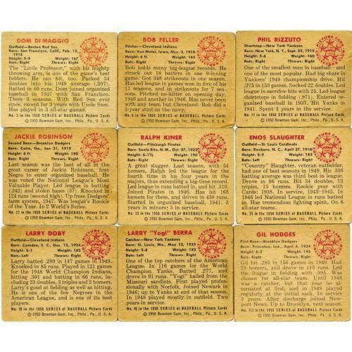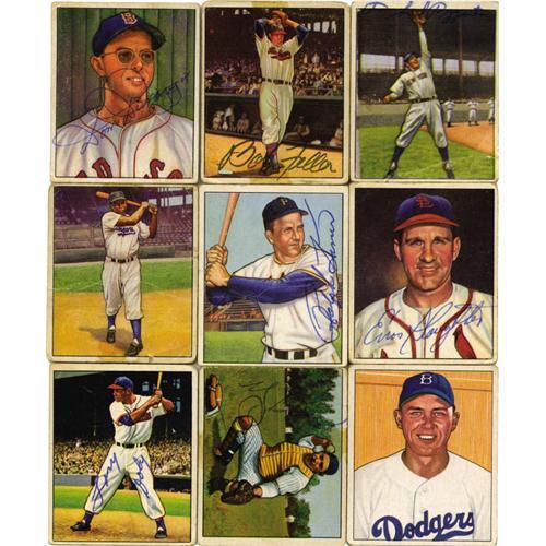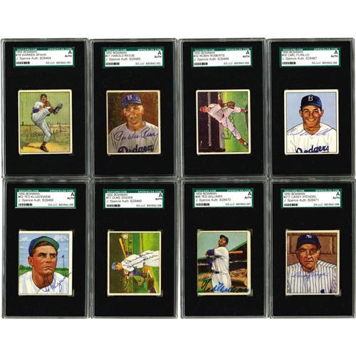<B>1950 Bowman Baseball Complete Set with Autographs (252).</B></I> A total of eight signed cards have been slabbed by <B>SGC/J. Spence Auth.</B></I> - #19 Spahn, 21 Reese, 32 Roberts, 58 Furillo, 62 Kluszewski, 77 Snider, 98 Williams, 217 Stengel. An additional 224 cards are signed including those noted below. Ungraded cards include #1 Parnell (auto, personalized), 3 Dom DiMaggio (auto), 6 Feller (auto, tape on front), 8 Kell (auto), 11 Rizzuto (auto), 22 Robinson (F, tape on front), 23 Newcombe (auto), 28 Thompson (auto), 33 Kiner (auto), 35 Slaughter (auto), 37 Appling (auto), 39 Doby (auto), 40 Lemon (auto), 43 Doerr (auto), 46 Berra (auto, tape on front), 71 Schoendienst (auto), 75 Campanella (auto, not authentic), 84 Ashburn (auto, secretarial), 112 Hodges (VG/EX), 139 Mize (auto, tape on front and back), 148 Wynn (auto), 219 Bauer (auto), 220 Durocher (auto). Set grades 40% EX to EX/MT, 30% VG to VG/EX, 30% FR to GD (some lesser due to writing or tape damage).