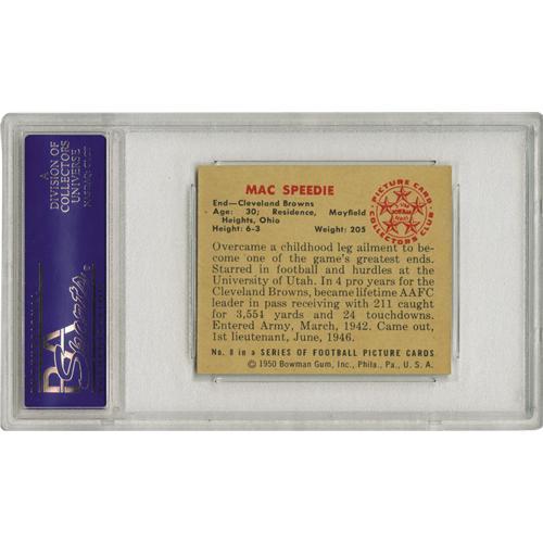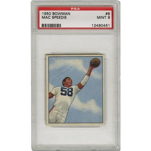 <B>1950 Bowman Max Speedie #8 PSA Mint 9.</B></I> Only a single submission has ever achieved a perfect ten rating from the folks at PSA, leaving this remarkable pack-fresh specimen in the rarest of company. Marvelous color and registration join an utter lack of wear to create a stunning piece of cardboard. High-end collectors take note.<BR><BR><b>Shipping:</b> Sportscard (<a target="_blank" href="http://www.heritageauctions.com/common/shipping.php">view shipping information</a>)