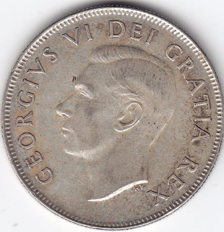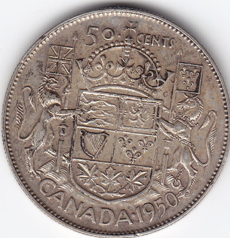 1950 Canadian Silver 50-Cent Half Dollar Coin - No Design - Significant Die Crack in Date - VF-30 Condition