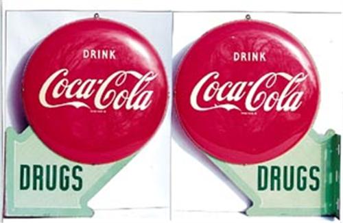 18"x22". Bright colors and shine. Both buttons have a few minor dents, some small paint chips and nicks and light scratches. The flange itself has a good bit of edge rust with some paint loss around the edges. Otherwise, some small scratches and marks. One of the buttons also has some advanced edge rust and bubbling and puckering. Cond. 7.0, displays much better.
