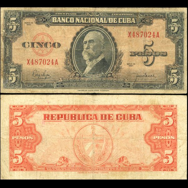 1950 Cuba 5 Peso Note Circulated (CUR-006374A)