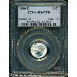 1950-D 10C MS67 Full Bands PCGS. Rose, gold, and a <B>1950-D 10C MS67 Full Bands PCGS.</B></I> Rose, gold, and aqua hues enrich this beautiful, lustrous, and splendidly struck Superb Gem. An excellent candidate for a competitive Registry Set. Population: 85 in 67, 2 finer (10/04). <BR><BR><B>Important notice:</B> Heritage usually auctions material at the rate of 200-250 lots per hour. On some occasions eBay Live bid software or the Internet may not be able to keep up with the pace of the auction. We recommend placing a realistic absentee bid now as insurance to avoid disappointment. Occasionally the auctioneer may eliminate or reject an eBay Live bid, and the auctioneer may also reopen a lot after the close of the eBay live bidding (usually because we missed an audience bid), and may reject your bid even if it shows you as the winning bidder. By bidding via eBay Live, you agree that Heritage may award the lot to another bidder at its sole discretion under the circumstances described above or any other reasonable circumstances. Since eBay bids are not shown to us until we open the lot on the floor, we treat those bids just like floor bids. In most cases the floor responds before the eBay bid is presented to us, due to Internet lag time, so for consistency we have made it a policy that floor bids are always considered first over tie eBay live bids. Also please note that all Heritage lots purchased through eBay Live carry a 20% Buyer's Premium. Please make sure you read the Terms and Conditions before you bid. This lot is being auctioned in conjunction with a live floor auction by Heritage Galleries & Auctioneers. All final auction and invoice information will be supplied by Heritage Galleries & Auctioneers, and all other information should be considered preliminary. Lot:5853