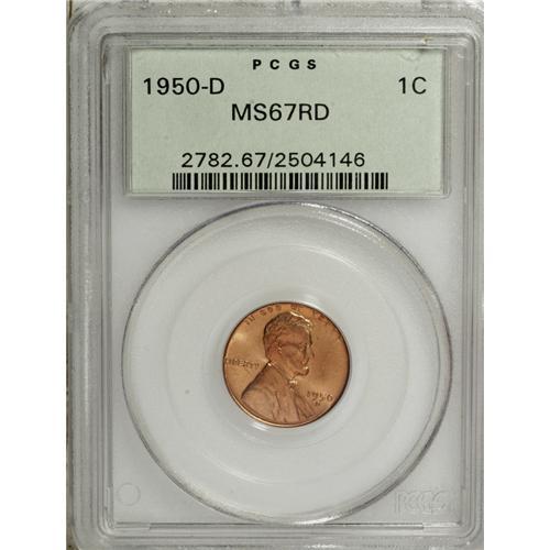 <B>1950-D 1C MS67 Red PCGS.</B></I> An essentially flawless sunset-orange representative that boasts razor sharp detail and dynamic luster. Like other Superb examples of the 1950-D offered in the past, innumerable die striations are seen across the reverse. Population: 27 in 67, 0 finer (12/06).<BR><BR><b>Shipping:</b> Coin/Currency (<a target="_blank" href="http://www.heritageauctions.com/common/shipping.php">view shipping information</a>)