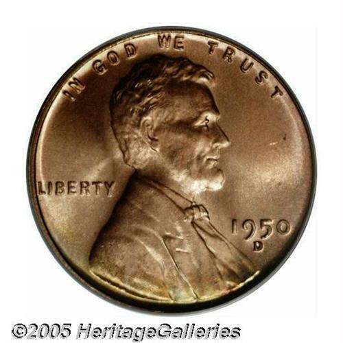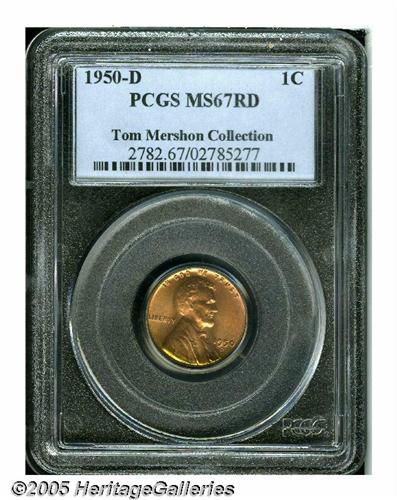 <B>1950-D<1C> MS67 Red PCGS.</B></I> An exquisite Superb Gem, the present example flirts with both technical and aesthetic perfection. Shades of rich gold with undertones of deep orange and lime cover much of the obverse while a small area above the date fades to rose. The reverse toning is more dramatic, with a blazing ring of gold and lime surrounding the vivid rose-magenta hued center. Well struck and extremely lustrous, with a couple of minuscule carbon flecks that are entirely forgivable when one considers the overall condition of the coin. Population: 23 in 67, 0 finer (3/05).<BR><I>From The Tom Mershon #2 All-Time PCGS Registry Set of Lincoln Wheat Cents.</B></I>