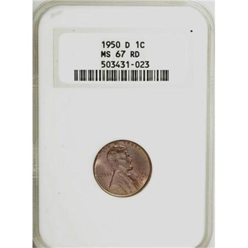 <B>1950-D 1C MS67 Red NGC.</B></I> . NGC Census: (152/0). Mintage: 118,505,000. Numismedia Wsl. Price for NGC/PCGS coin in MS67: $125. (#2782)<BR><BR><B>Coin Engraver:</B> Victor D. Brenner<BR><BR><b>Shipping:</b> Coins & Currency (<a target="_blank" href="http://www.heritageauctions.com/common/shipping.php">view shipping information</a>)
