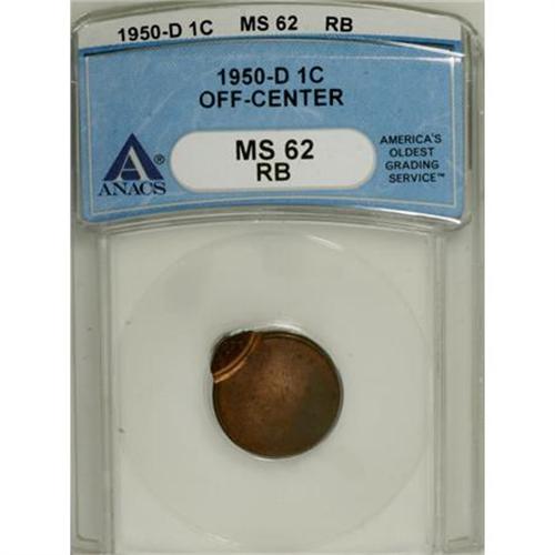 <B>1950-D 1C Lincoln Cent--Off Center--MS62 Red and Brown ANACS.</B></I> <BR><BR><B>Coin Engraver:</B> Victor D. Brenner<BR><BR><b>Shipping:</b> Coins & Currency (<a target="_blank" href="http://www.heritageauctions.com/common/shipping.php">view shipping information</a>)