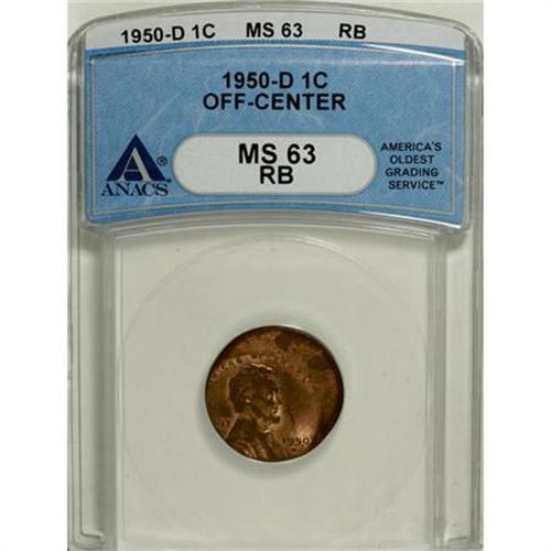 <B>1950-D 1C Lincoln Cent--Off Center MS63 Red and Brown ANACS.</B></I><BR><BR><B>Coin Engraver:</B> Victor D. Brenner<BR><BR><b>Shipping:</b> Coins & Currency (<a target="_blank" href="http://www.heritageauctions.com/common/shipping.php">view shipping information</a>)