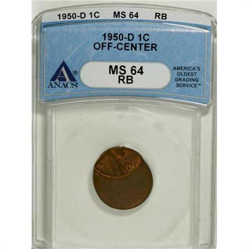 <B>1950-D 1C Cent--Off Center--MS64 Red and Brown ANACS.</B></I> <BR><BR><B>Coin Engraver:</B> Victor D. Brenner<BR><BR><b>Shipping:</b> Coins & Currency (<a target="_blank" href="http://www.heritageauctions.com/common/shipping.php">view shipping information</a>)
