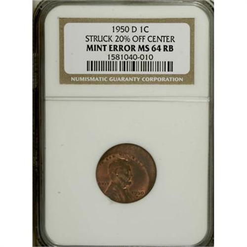<B>1950-D 1C Lincoln Cent--Struck 20% Off Center--MS64 Red and Brown NGC.</B></I> <BR><BR><B>Coin Engraver:</B> Victor D. Brenner<BR><BR><b>Shipping:</b> Coins & Currency (<a target="_blank" href="http://www.heritageauctions.com/common/shipping.php">view shipping information</a>)