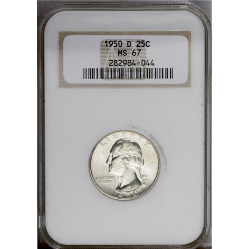 <B>1950-D<25C> MS67 NGC.</B></I> Lustrous surfaces are visited by nearly imperceptible whispers of light champagne-gold color, and are quite well preserved. All of the design features are nicely impressed. Numerous die striations are visible in the obverse fields. NGC has graded one example finer (1/06).
