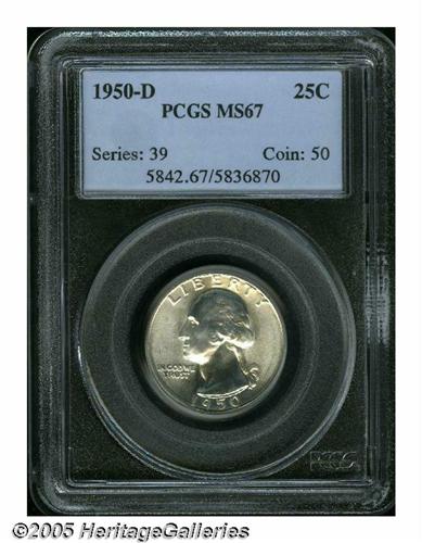 <B>1950-D<25C> MS67 PCGS.</B></I> A gently toned and attractively preserved Superb Gem that has booming luster and a good strike. Population: 34 in 67, 0 finer (3/05).<BR><I>From The Gary Kramer Collection of Washington Quarters.</B></I>