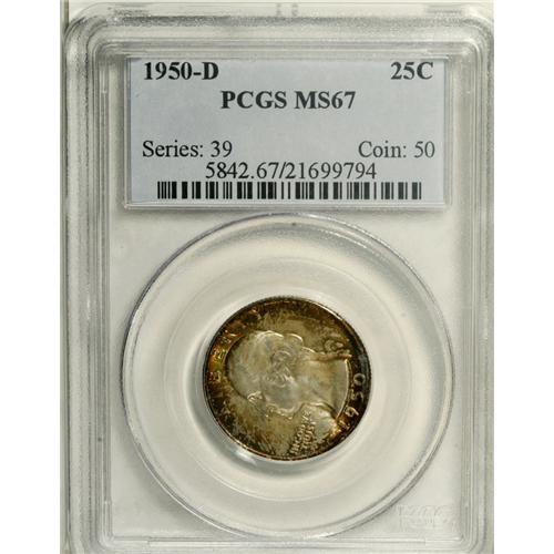 1950-D 25C MS67 PCGS. Potent luster rolls under the vi