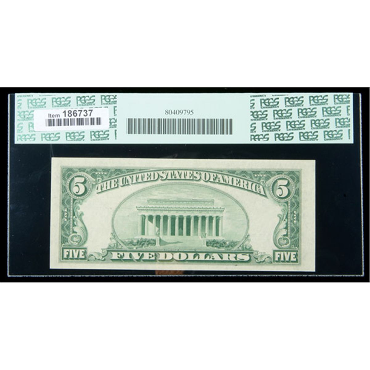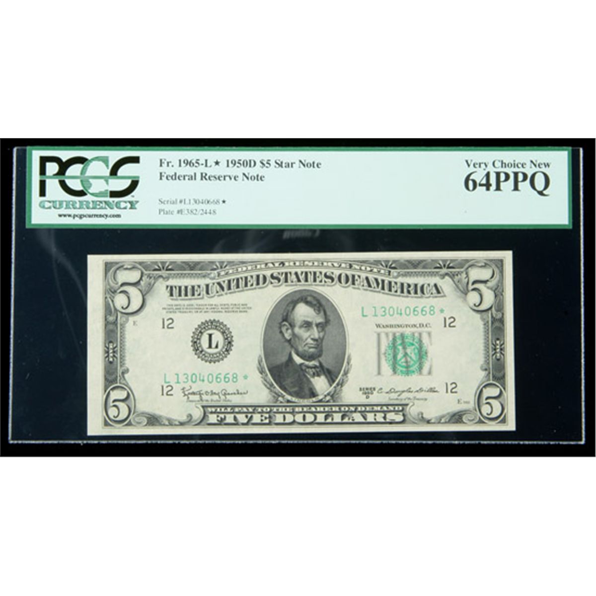 1950-D, $5 Federal Reserve Note. Star Note. PCGS Very Choice New 64PPQ. . Fr-1965-L*. Boldly embossed and with deep inks and overprint color, with the grade limited only by centering.