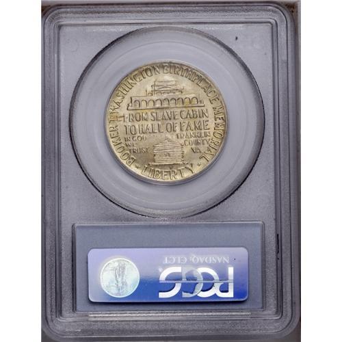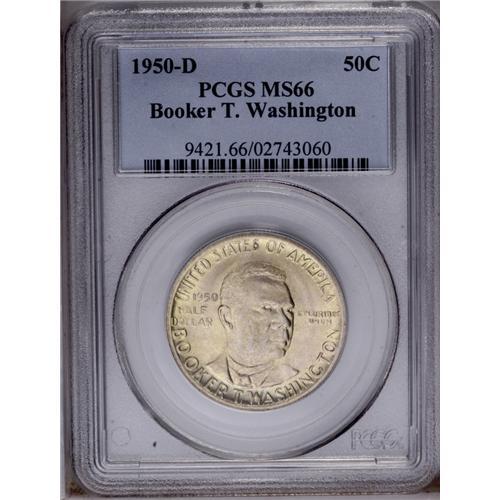 <B>1950-D<50C> Booker T. Washington MS66 PCGS.</B></I> A nicely struck Premium Gem that has flashy luster and pleasing golden-mint patina abundantly overlaying each side. Only 6,000 pieces were issued. Population: 100 in 66, 1 finer (3/06). <BR><BR><B>Important notice:</B> Heritage usually auctions material at the rate of 200-250 lots per hour. On some occasions eBay Live bid software or the Internet may not be able to keep up with the pace of the auction. We recommend placing a realistic absentee bid now as insurance to avoid disappointment. Occasionally the auctioneer may eliminate or reject an eBay Live bid, and the auctioneer may also reopen a lot after the close of the eBay live bidding (usually because we missed an audience bid), and may reject your bid even if it shows you as the winning bidder. By bidding via eBay Live, you agree that Heritage may award the lot to another bidder at its sole discretion under the circumstances described above or any other reasonable circumstances. Since eBay bids are not shown to us until we open the lot on the floor, we treat those bids just like floor bids. In most cases the floor responds before the eBay bid is presented to us, due to Internet lag time, so for consistency we have made it a policy that floor bids are always considered first over tie eBay live bids. Also please note that all Heritage lots purchased through eBay Live carry a 20% Buyer's Premium. Please make sure you read the Terms and Conditions before you bid. This lot is being auctioned in conjunction with a live floor auction by Heritage Galleries & Auctioneers. All final auction and invoice information will be supplied by Heritage Galleries & Auctioneers, and all other information should be considered preliminary. Lot:5123 <BR><BR><B>Winning Notification and Billing:</B> After the FINAL session in this auction is complete, Heritage will send e-mail and snail mail invoices. This process normally takes several days. All final auction and invoice information will be supplied by Heritage Galleries & Auctioneers, and all other information should be considered preliminary. <BR><BR>This auction will be conducted on a live auction floor and over the Internet through eBay Live. If you choose to place an absentee bid, please take a moment to <font color='#0000ff'><u><a href='http://pages.ebay.com/liveauctions/help/before/laabsentee.html'>learn how eBay Live absentee bidding works</a></u></font><font color='#000000'>