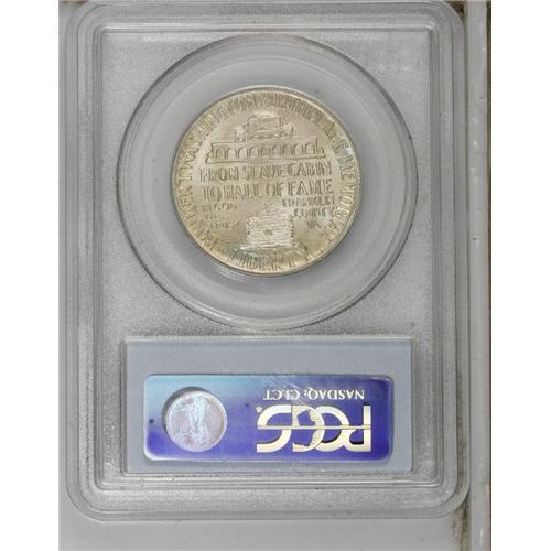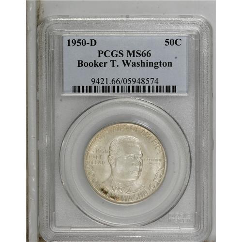 <B>1950-D 50C Booker T. Washington MS66 PCGS.</B></I> Glowing luster emanates from silver-gray surfaces that are accented with whispers of reddish-tan and yellow-gold. Generally well preserved and sharply struck.<BR><BR><b>Shipping:</b> Coins & Currency (<a target="_blank" href="http://www.heritageauctions.com/common/shipping.php">view shipping information</a>)