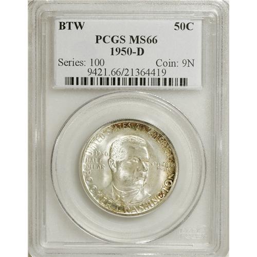 <B>1950-D 50C Booker T. Washington MS66 PCGS.</B></I> The Denver Mint struck Booker T. Washington halves for sets only, as the distributors always ordered extra coins from either Philadelphia or San Francisco. Apricot-gold and reddish-brown toning graces the peripheral zones of this shining Premium Gem, while the fields have silver-gray patina with ice-blue accents. PCGS has certified only two Superb Gem representatives (4/07).<BR><I>From The Cary & Cheryl Porter Collection.</B></I><BR><BR><b>Shipping:</b> Coins & Currency (<a target="_blank" href="http://www.heritageauctions.com/common/shipping.php">view shipping information</a>)