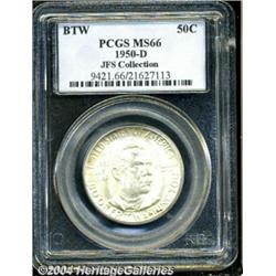 <B>1950-D<50C> Booker T. Washington MS66 PCGS.</B></I> Suggestions of golden-tan peripheral color interrupt the otherwise silver sheen of this premium Gem. Both sides are awash in full mint luster that is readily appreciable in the virtual absence of distractions. Population: 69 in 66, 0 finer (3/04).<BR><I>Ex: FUN Signature Sale (Heritage, 1/01), as part of lot 9197, which realized $1,035.</B></I><BR><I>From the JFS Collection, the #1 All-Time PCGS Registry Set.</B></I> <BR><BR><B>Important notice:</B> Heritage usually auctions material at the rate of 200-250 lots per hour. On some occasions eBay Live bid software or the Internet may not be able to keep up with the pace of the auction. We recommend placing a realistic absentee bid now as insurance to avoid disappointment. Occasionally the auctioneer may eliminate or reject an eBay Live bid, and the auctioneer may also reopen a lot after the close of the eBay live bidding (usually because we missed an audience bid), and may reject your bid even if it shows you as the winning bidder. By bidding via eBay Live, you agree that Heritage may award the lot to another bidder at its sole discretion under the circumstances described above or any other reasonable circumstances. Since eBay bids are not shown to us until we open the lot on the floor, we treat those bids just like floor bids. In most cases the floor responds before the eBay bid is presented to us, due to Internet lag time, so for consistency we have made it a policy that floor bids are always considered first over tie eBay live bids. Also please note that all Heritage lots purchased through eBay Live carry a 20% Buyer's Premium. Please make sure you read the Terms and Conditions before you bid. </span></font></tr></table></td></tr></table>