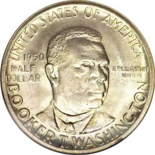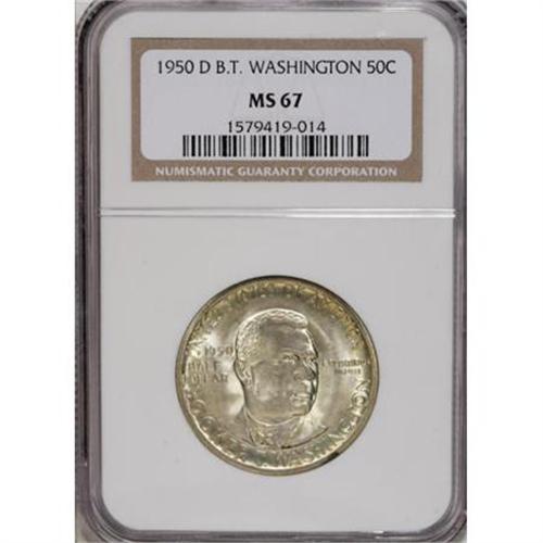 <B>1950-D 50C Booker T. Washington MS67 NGC.</B></I> A coat of champagne-gold color imbued with hints of ice-blue rests over the highly lustrous surfaces of this wonderful Booker T. Washington commemorative. A solid strike leaves impressive definition on the design elements, and close inspection reveals no mentionable marks. Census: 10 in 67, 0 finer (12/07).<BR><BR><b>Shipping:</b> Coins & Currency (<a target="_blank" href="http://www.heritageauctions.com/common/shipping.php">view shipping information</a>)