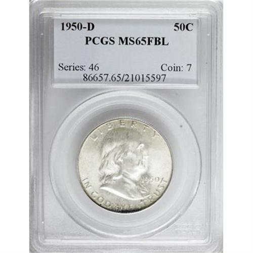 <B>1950-D 50C MS65 Full Bell Lines PCGS.</B></I> PCGS Population (415/45). NGC Census: (230/6). Numismedia Wsl. Price for NGC/PCGS coin in MS65: $400. (#86657)<BR><BR><b>Shipping:</b> Coins & Currency (<a target="_blank" href="http://www.heritageauctions.com/common/shipping.php">view shipping information</a>)