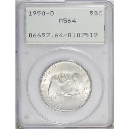 <B>1950-D 50C MS64 PCGS.</B></I> PCGS Population (592/84). NGC Census: (443/188). Mintage: 8,031,600. Numismedia Wsl. Price for NGC/PCGS coin in MS64: $48. (#6657)<BR><BR><B>Coin Engraver:</B> John R. Sinnock<BR><BR><b>Shipping:</b> Coins & Currency (<a target="_blank" href="http://www.heritageauctions.com/common/shipping.php">view shipping information</a>)
