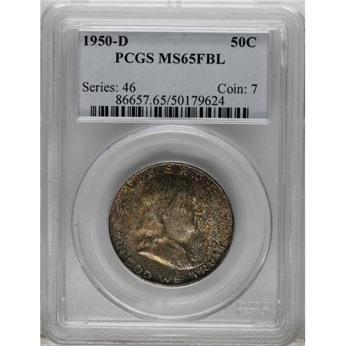<B>1950-D 50C MS65 Full Bell Lines PCGS.</B></I> Deeply dappled golden-brown and forest-green toning suggests prior long-term storage in a double mint set. The luster is vibrant, and the fields are unperturbed. Franklin has a couple of inconspicuous marks.<BR><BR><b>Shipping:</b> Coins & Currency (<a target="_blank" href="http://www.heritageauctions.com/common/shipping.php">view shipping information</a>)