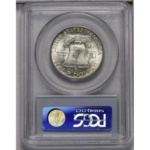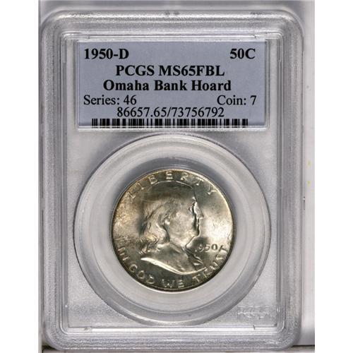 <B>1950-D<50C> MS65 Full Bell Lines PCGS.</B></I> Ex: Omaha Bank Hoard. This lustrous Gem has light tan-gray toning that deepens in chestnut shades across the left obverse field. A thin mark on the bell post determines the grade.
