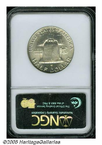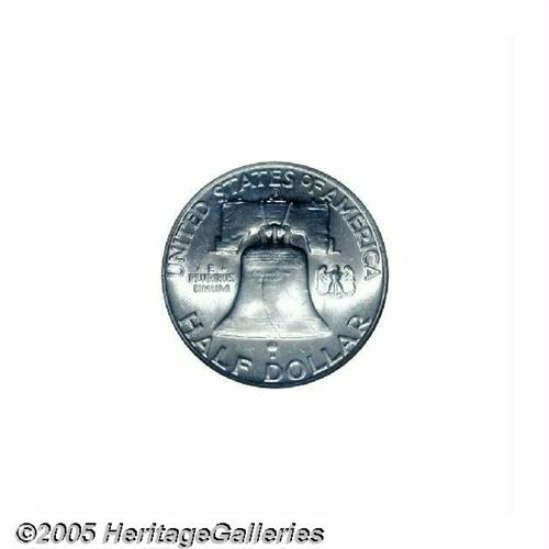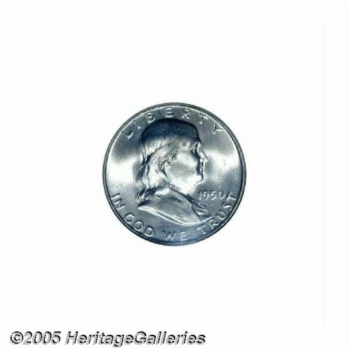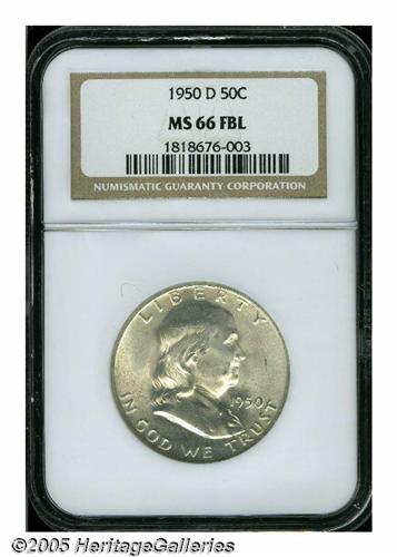 <B>1950-D<50C> MS66 Full Bell Lines NGC.</B></I> An almost fully white Franklin Half with glowing satiny fields. While the coin exhibits few noticeable abrasions, several luster grazes are apparent on the bell. Sharply defined.
