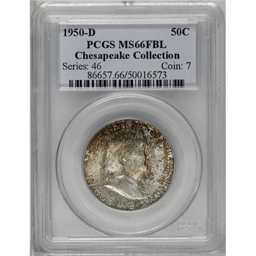 <B>1950-D<50C> MS66 Full Bell Lines PCGS.</B></I> Ex: Chesapeake Collection. The dappled apple-green and copper-red patina competes for territory with the underlying dove-gray color. This is a Premium Gem that has it all: a bold strike, dynamic luster, and exquisite preservation. A wonderful example that would improve even the finest specialized collection. As of March, 2006, only a combined total of 43 coins have been graded by PCGS and NGC at this grade level, with none finer.<BR><I>From The Alex & Nan Registry Sets.</B></I> <BR><BR><B>Important notice:</B> Heritage usually auctions material at the rate of 200-250 lots per hour. On some occasions eBay Live bid software or the Internet may not be able to keep up with the pace of the auction. We recommend placing a realistic absentee bid now as insurance to avoid disappointment. Occasionally the auctioneer may eliminate or reject an eBay Live bid, and the auctioneer may also reopen a lot after the close of the eBay live bidding (usually because we missed an audience bid), and may reject your bid even if it shows you as the winning bidder. By bidding via eBay Live, you agree that Heritage may award the lot to another bidder at its sole discretion under the circumstances described above or any other reasonable circumstances. Since eBay bids are not shown to us until we open the lot on the floor, we treat those bids just like floor bids. In most cases the floor responds before the eBay bid is presented to us, due to Internet lag time, so for consistency we have made it a policy that floor bids are always considered first over tie eBay live bids. Also please note that all Heritage lots purchased through eBay Live carry a 20% Buyer's Premium. Please make sure you read the Terms and Conditions before you bid. This lot is being auctioned in conjunction with a live floor auction by Heritage Galleries & Auctioneers. All final auction and invoice information will be supplied by Heritage Galleries & Auctioneers, and all other information should be considered preliminary. Lot:3089 <BR><BR><B>Winning Notification and Billing:</B> After the FINAL session in this auction is complete, Heritage will send e-mail and snail mail invoices. This process normally takes several days. All final auction and invoice information will be supplied by Heritage Galleries & Auctioneers, and all other information should be considered preliminary. <BR><BR>This auction will be conducted on a live auction floor and over the Internet through eBay Live. If you choose to place an absentee bid, please take a moment to <font color='#0000ff'><u><a href='http://pages.ebay.com/liveauctions/help/before/laabsentee.html'>learn how eBay Live absentee bidding works</a></u></font><font color='#000000'>