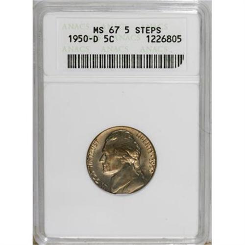<B>1950-D 5C MS67 Full Steps ANACS.</B></I> NGC Census: (9/0). PCGS Population (4/0). (#84042)<BR><BR><b>Shipping:</b> Coins & Currency (<a target="_blank" href="http://www.heritageauctions.com/common/shipping.php">view shipping information</a>)