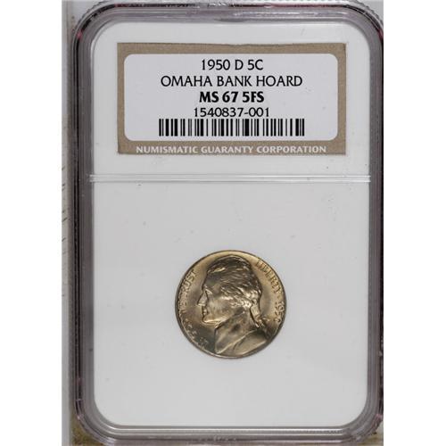 <B>1950-D 5C MS67 Five Full Steps NGC.</B></I> Ex: Omaha Bank Hoard. The 1950-D has a low mintage of 2.63 million pieces, but the issue is best known as the focal point of the roll-collecting boom, circa 1955 to 1964. Although Mint State rolls have been hoarded since its production, most examples lack the crisp strike and nearly unmarked surfaces of the present Superb Gem. Light blended pearl-gray and tan toning only adds to the eye appeal. Census: 8 in 67 Five Full Steps, 0 finer (10/06).<BR><BR><b>Shipping:</b> Coin/Currency (<a target="_blank" href="http://www.heritageauctions.com/common/shipping.php">view shipping information</a>)