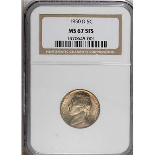 <B>1950-D 5C MS67 Five Full Steps NGC.</B></I> The 1950-D nickel is one of the best-known issues from the 20th century. It was widely hoarded at the time of issue and was the centerpiece of the roll market in the early 1960s. Approximately one in ten '50-D nickels have five full steps. However, most examples are plagued with problems other than strike, such as indifferent luster and evidence of having been struck from heavily worn dies. This is an exceptionally lustrous coin that has no noticeable abrasions on either side (after all, it is an MS67), and each side is covered with even golden-brown toning. Census: 9 in 67, 0 finer (10/07).<BR><BR><b>Shipping:</b> Coins & Currency (<a target="_blank" href="http://www.heritageauctions.com/common/shipping.php">view shipping information</a>)