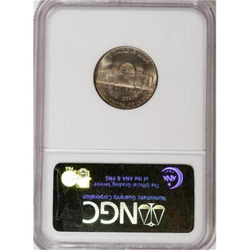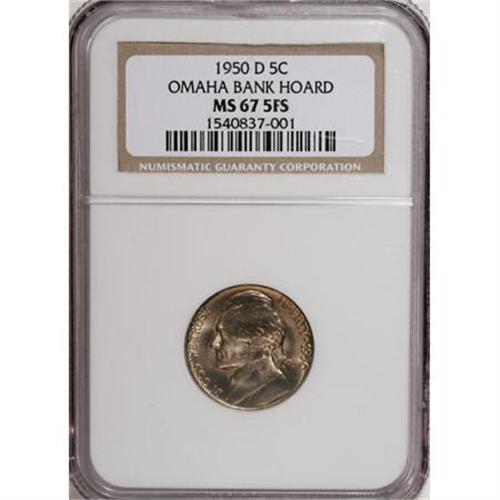 <B>1950-D 5C MS67 Five Full Steps NGC.</B></I> Ex: Omaha Bank Hoard. The 1950-D has a low mintage of 2.63 million pieces, but the issue is best known as the focal point of the roll-collecting boom, circa 1955 to 1964. Although Mint State rolls have been hoarded since its production, most examples lack the crisp strike and minimally marked surfaces of the present Superb Gem. Light blended pearl-gray and tan toning only adds to the eye appeal. Census: 98 in 67 Five Full Steps, 0 finer (11/07).<BR><I>From The New York Eye Appeal Collection, Part Three.</B></I><BR><BR><b>Shipping:</b> Coins & Currency (<a target="_blank" href="http://www.heritageauctions.com/common/shipping.php">view shipping information</a>)