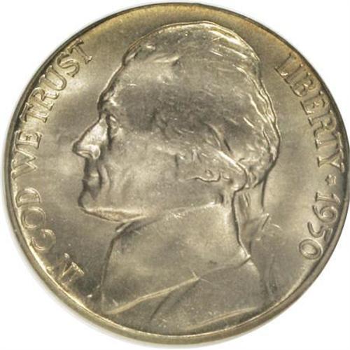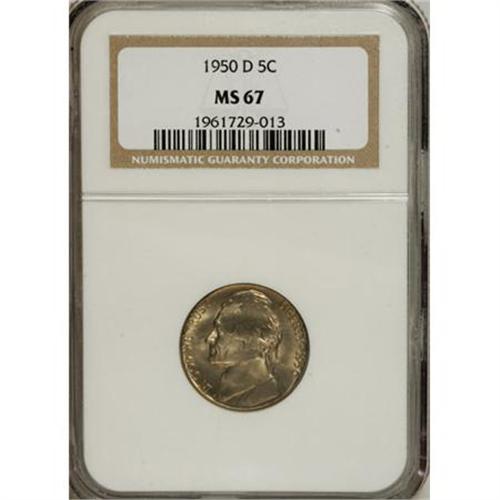 <B>1950-D 5C MS67 NGC.</B></I> NGC Census: (202/0). PCGS Population (4/0). Mintage: 2,630,030. Numismedia Wsl. Price for NGC/PCGS coin in MS67: $95. (#4042)<BR><BR><B>Coin Engraver:</B> Felix Schlag<BR><BR><b>Shipping:</b> Coins & Currency (<a target="_blank" href="http://www.heritageauctions.com/common/shipping.php">view shipping information</a>)