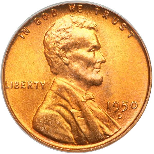 1950-D Lincoln Cent. PCGS graded MS-67 Red. Fully red and boldly struck. Tied for the finest graded at PCGS. An incredible blazing Gem and as fresh as if someone were standing beside the coining press wearing white cotton gloves to capture it the moment the machine ejected it! Pop 30; none finer at PCGS (PCGS # 2782) .