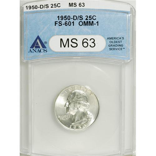 1950-D/S 25C MS63 ANACS. FS-601, OMM-1. NGC Census