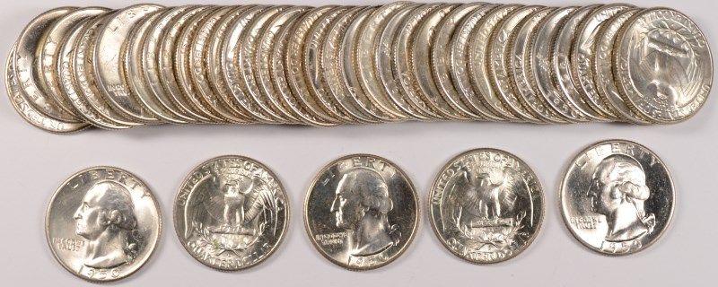 1950-D WASHINGTON QUARTER ROLL, GEM BU, MS-64,65 AND 66 COINS, ( 40 ) PIECES