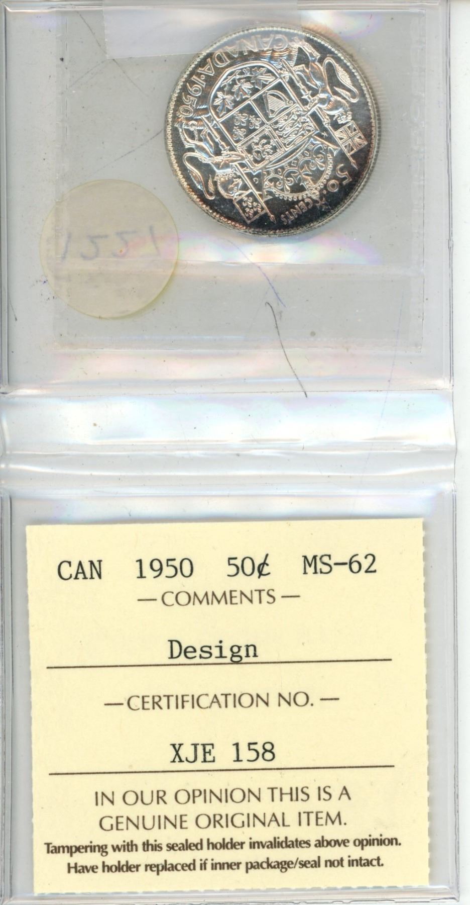 1950 Design Canadian Silver 50 Cents. ICCS certified and graded MS-62. Beautifully Toned.
