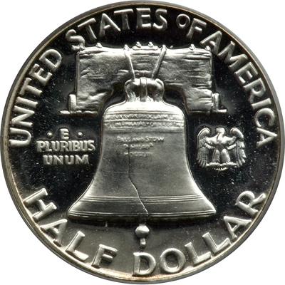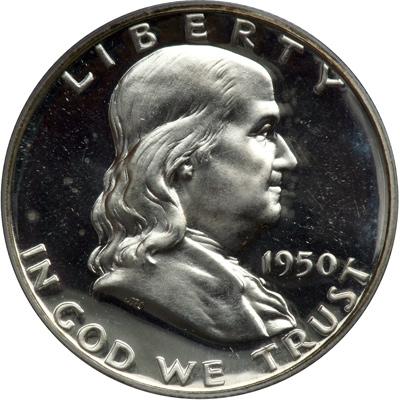 1950 Franklin Half Dollar. PCGS graded Proof 65 Cameo. Totally white. An impressive cameo gem of this elusive first Proof year the Franklin half dollar series. Pop 82; 21 in 66, 2 in 67 (PCGS # 86691) .