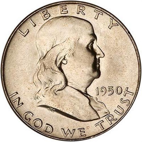 A frosted white 1950 half dollar that has a good strike and careening luster.