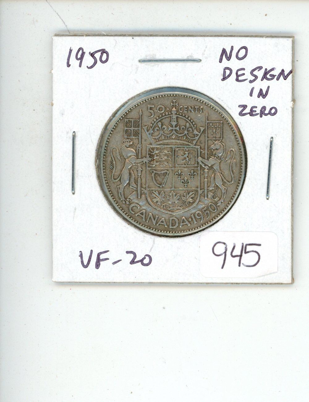 1950 George VI Silver 50 Cents. No Design in Zero in Date. VF-20.