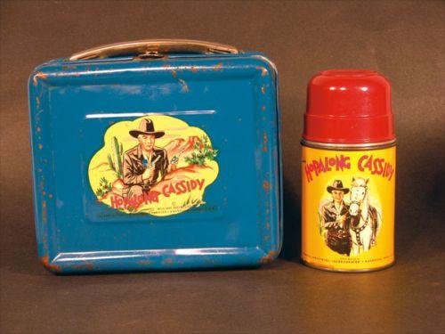 1950 Hopalong Cassidy Lunch Box, with thermos, blue. Some paint loss around perimeter otherwise good condition. 8 1/2 X 7 1/2 X 3 1/2 .