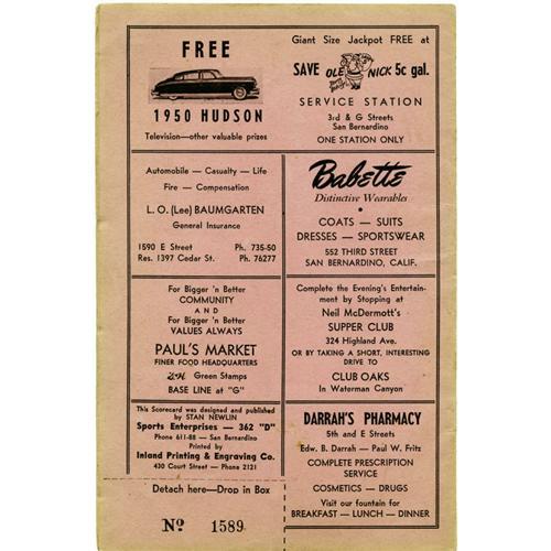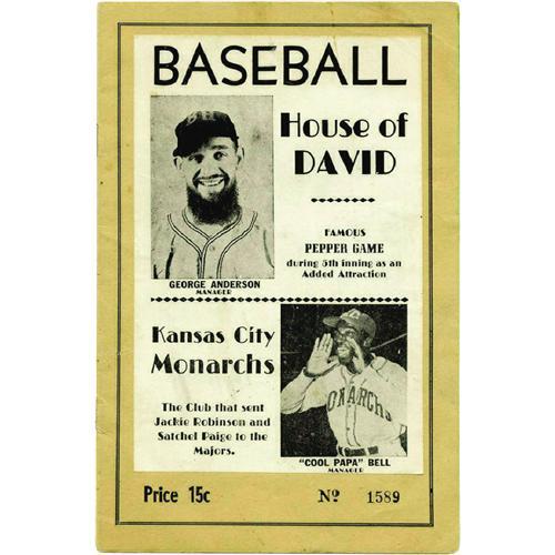 <B>1950 House of David vs. Kansas City Monarchs Program.</B></I> In the barnstorming age, there was no bigger draw than the bearded and bizarre House of David, and "The Club that sent Jackie Robinson and Satchel Paige to the Majors," as the cover page describes the Kansas City Monarchs. The eight-page scorecard is endearingly low budget, with the cover and rosters glued in place onto a program used for the local San Bernardino minor league squad. Most notable among those present at this game was the man pictured on lower right on the cover, the Hall of Fame Negro League legend "Cool Papa" Bell. The program shows light to moderate wear, with some edge wear, but no creases, folds, loose pages, or significant staining. The mere existence of a program such as this is a wonder, but to find one in such strong shape is just remarkable. <BR><BR><B>Important notice:</B> Heritage usually auctions material at the rate of 200-250 lots per hour. On some occasions eBay Live bid software or the Internet may not be able to keep up with the pace of the auction. We recommend placing a realistic absentee bid now as insurance to avoid disappointment. Occasionally the auctioneer may eliminate or reject an eBay Live bid, and the auctioneer may also reopen a lot after the close of the eBay live bidding (usually because we missed an audience bid), and may reject your bid even if it shows you as the winning bidder. By bidding via eBay Live, you agree that Heritage may award the lot to another bidder at its sole discretion under the circumstances described above or any other reasonable circumstances. Since eBay bids are not shown to us until we open the lot on the floor, we treat those bids just like floor bids. In most cases the floor responds before the eBay bid is presented to us, due to Internet lag time, so for consistency we have made it a policy that floor bids are always considered first over tie eBay live bids. Also please note that all Heritage lots purchased through eBay Live carry a 22.5% Buyer's Premium. Please make sure you read the Terms and Conditions before you bid. This lot is being auctioned in conjunction with a live floor auction by Heritage Galleries & Auctioneers. All final auction and invoice information will be supplied by Heritage Galleries & Auctioneers, and all other information should be considered preliminary. Lot:19525 <BR><BR><B>Winning Notification and Billing:</B> After the FINAL session in this auction is complete, Heritage will send e-mail and snail mail invoices. This process normally takes several days. All final auction and invoice information will be supplied by Heritage Galleries & Auctioneers, and all other information should be considered preliminary. <BR><BR>This auction will be conducted on a live auction floor and over the Internet through eBay Live. If you choose to place an absentee bid, please take a moment to <font color='#0000ff'><u><a href='http://pages.ebay.com/liveauctions/help/before/laabsentee.html'>learn how eBay Live absentee bidding works</a></u></font><font color='#000000'>