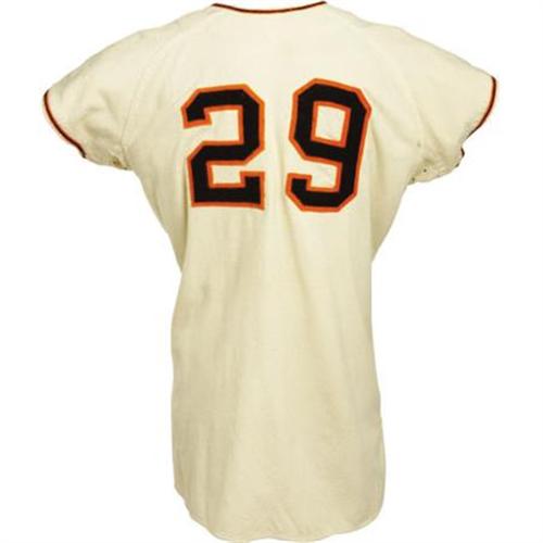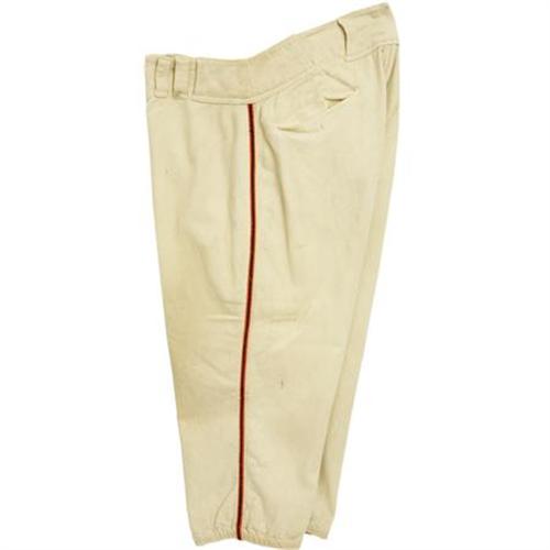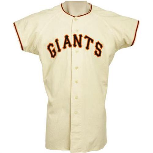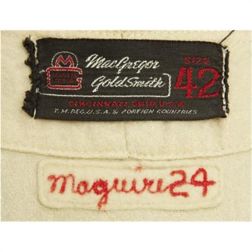 <B>1950 Jack Maguire Game Worn Uniform.</B></I> We could legitimately point out that the offered home white flannel is Maguire's rookie model, though the appeal here is clearly the gorgeous New York Giants style, given Maguire's brief service to the Major Leagues. Despite the fact that the jersey's former owner is no household name, we are nonetheless transported back to the Polo Grounds by the sight of his shirt, which proclaims "Giants" with black and orange felt in the classic Old English font. Number "29" appears upon verso, though we must note that the second digit has been changed from its original "4." The "2" remains original and unmoved, and the number change clearly was rendered soon after, or perhaps even during, the 1950 season. "Maguire 24" is embroidered upon a felt swatch inside the collar, below the "MacGregor Goldsmith size 42" maker's label. A "Set 1 1950" flap tag is affixed to the interior button path. The jersey shows fine wear but surrenders none of its beauty to age, remaining free of staining or cloth damage. The matching pants have no player attribution or year tagging, but provide "A.G. Spalding & Bros." manufacturer's tagging framed by "Dry Clean Only" and size "36" labels. Vintage team repairs are noted, but the pants otherwise present wonderfully and make a perfect visual complement to the jersey. <I>LOA from Lou Lampson.</B></I><BR><BR><b>Shipping:</b> Clothing, Costumes & Jerseys (<a target="_blank" href="http://www.heritageauctions.com/common/shipping.php">view shipping information</a>)
