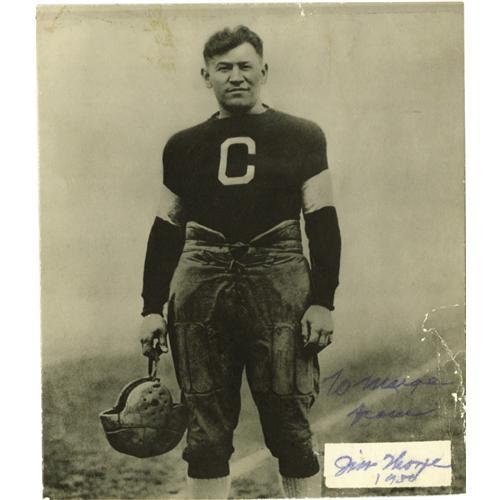 <B>1950 Jim Thorpe Signed Photograph.</B></I> The definitive image of the Native American superstar athlete in the uniform of the Canton Bulldogs is inscribed in 8/10 blue ink "To Marge from Jim Thorpe 1950." The photo measures 6.5x7.5" in size, and is mounted to a cardboard backing that has greatly minimized a bit of wear visible at the right edge of the image. It should be stressed that this wear does not affect the inscription or signature, leaving this one of the most desirable signed Thorpe photos on the market. <I>LOA from PSA/DNA.</B></I>