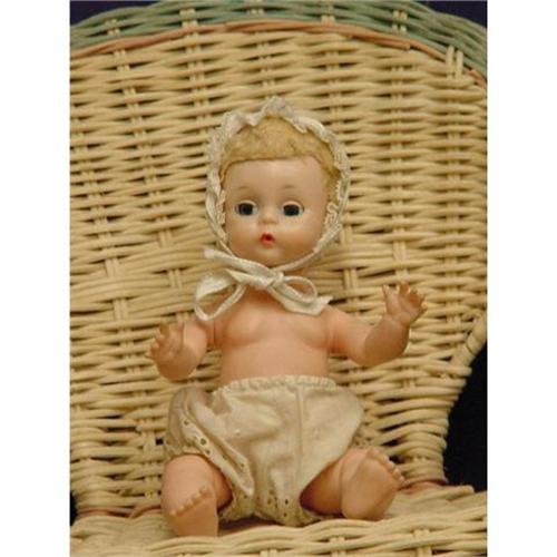 1950 Madame Alexander Little Genius, Very Good Condition. Cute 8 inch babydoll wearing the original shorts of eyelet fabric and matching bonnet. She has nice coloribng on the face and the caracoul blonde wig is in good condition. This sweetheart is a treasure to be cherished!