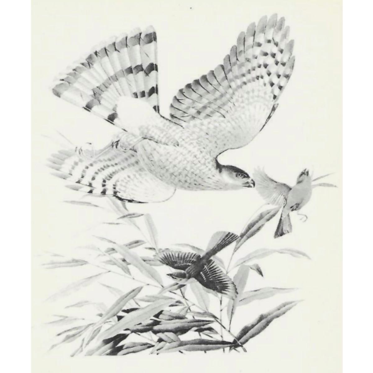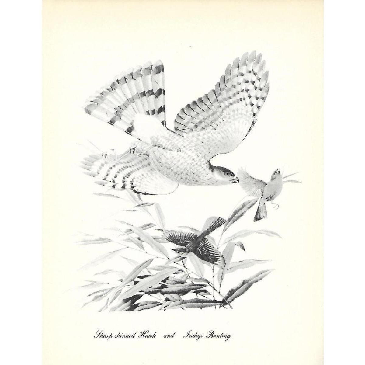 1950 Menaboni Print, Sharp-skinned Hawk & Indigo Bunting (b/w) Vintage 1950 book plate lithograph, Sharp-skinned Hawk & Indigo Bunting (b/w), by Athos Menaboni (Italy, Georgia 1895 - 1990 ) from "Menaboni's Birds". Approx 9" X12". Comes with 11" X 14" mat. Considered by some the Audubon of the 20th Century, Athos Menaboni was born in Italy but lived most of his life in the southern United States (Georgia). He is known for his beautifully detailed and lifelike renderings of birds but was also an accomplished painter of diverse subjects including botanicals, seascapes, landscapes &mosaics. During his sixty-year career he is credited with painting over 150 species of American birds. Â